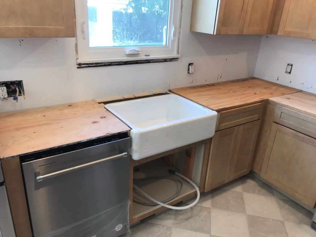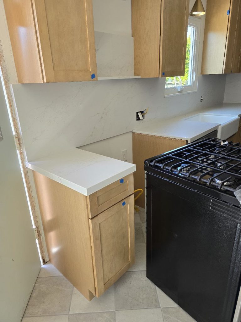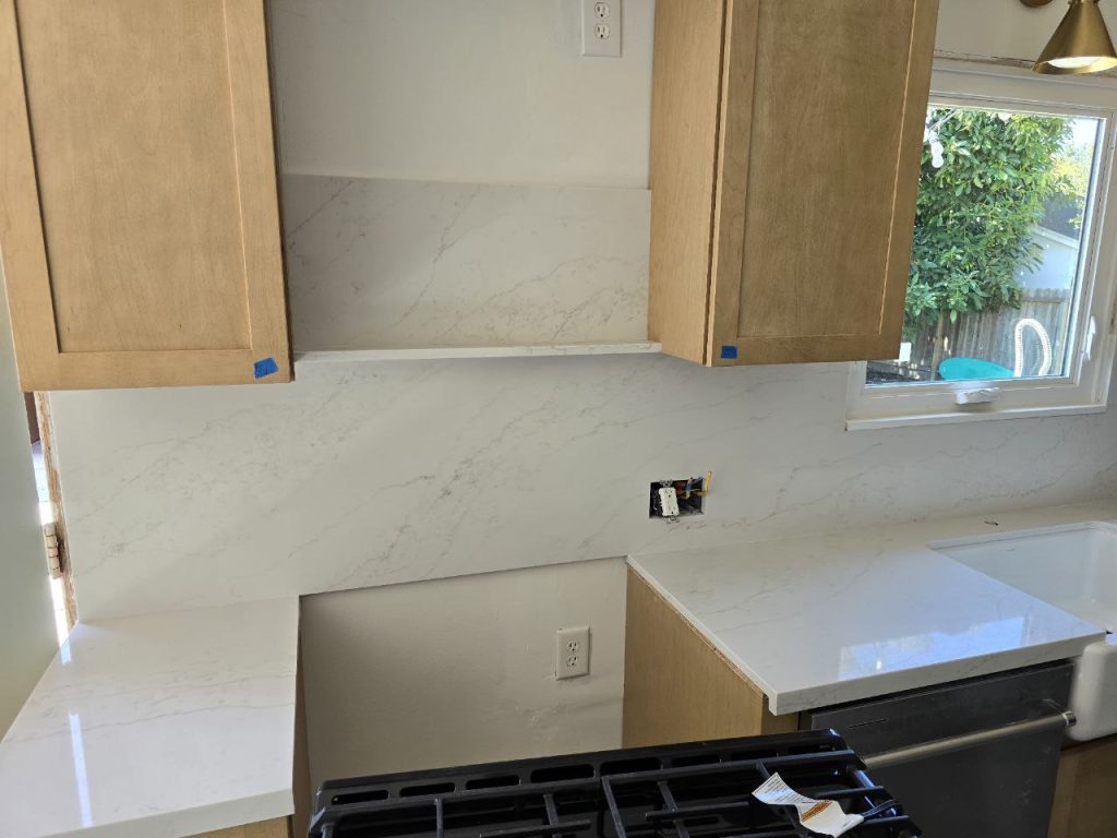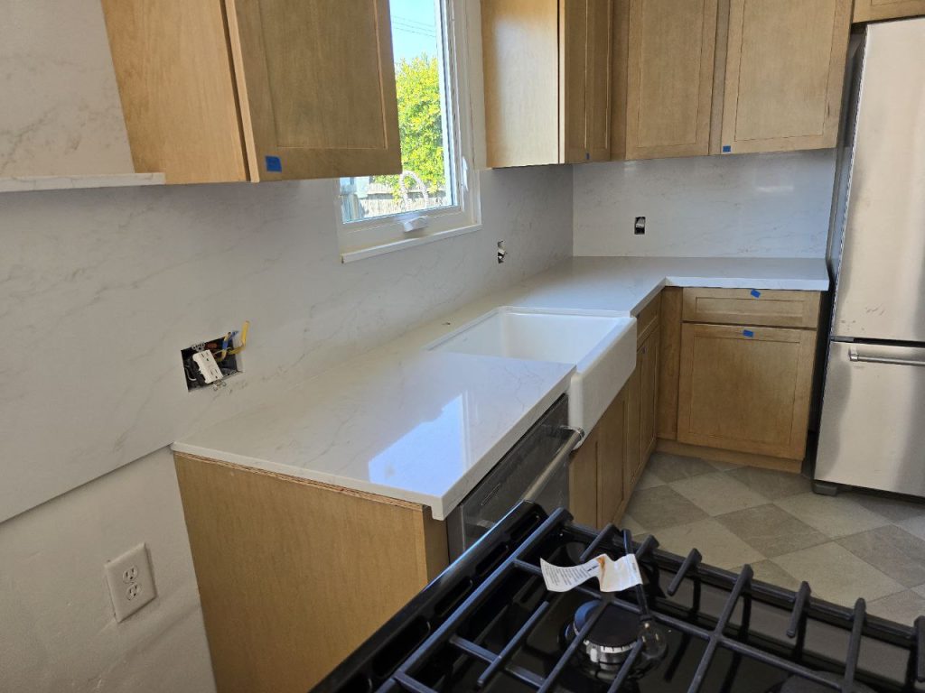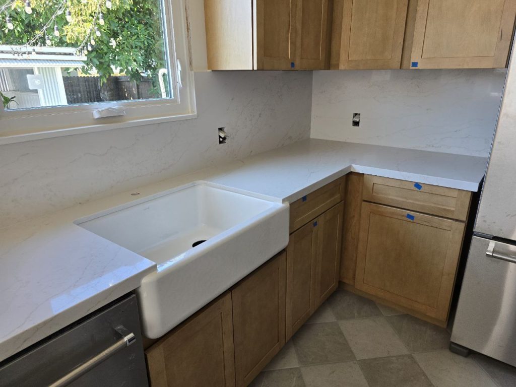 Vadara Calacatta Dorada quartz slabs for kitchen countertp with full backsplash, ledge, farm style sink.